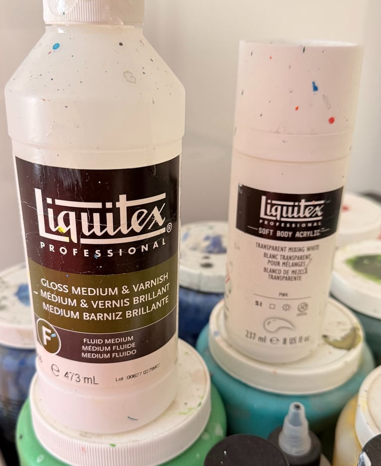 This one enhances color depth, increases gloss and flow, and can also act as a final varnish. It dries clear, flexible, and water-resistant. I use it for glazing, as a fixative, and as a binder in collages. You can thin it with a bit of water, but don’t go overboard with the brushing - it might fog a bit when dry. Test first, always. And no, don’t mix it with oils.